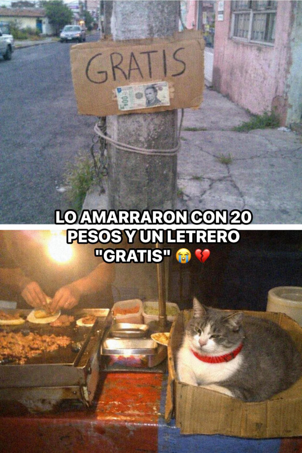 Don Raúl el taquero de la esquina llegó a abrir su puesto a las 6 de la tarde y encontró un gato amarrado a un poste con un letrero de cartón que decía "gratis" y un billete de 20 pesos pegado con cinta